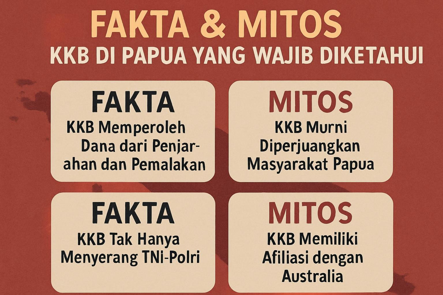 Isu mengenai Kelompok Kriminal Bersenjata (KKB) di Papua kerap menjadi pemberitaan yang kompleks dan penuh dengan narasi yang simpang siur. Banyak informasi yang beredar, namun tidak semuanya didasarkan pada fakta yang utuh. Untuk memahami konflik ini secara lebih jelas, penting untuk memisahkan antara fakta dan mitos KKB yang beredar di masyarakat.